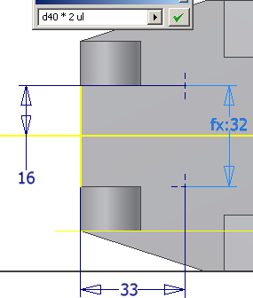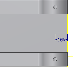 Установите общее расстояние между двумя точками. Выберите две центральные точки. Вместо добавления числа для общего расстояния, очистите значение в диалоговом окне. Затем для добавления переменной расстояния в диалоговое окно выберите размер 16 мм. Введите знак умножения *, а затем число 2. Прим.: Переменные размера в вашем эскизе могут отличаться от чисел, показанных на следующем рисунке. Даже если имеются отличия, это не имеет принципиального значения для упражнения.