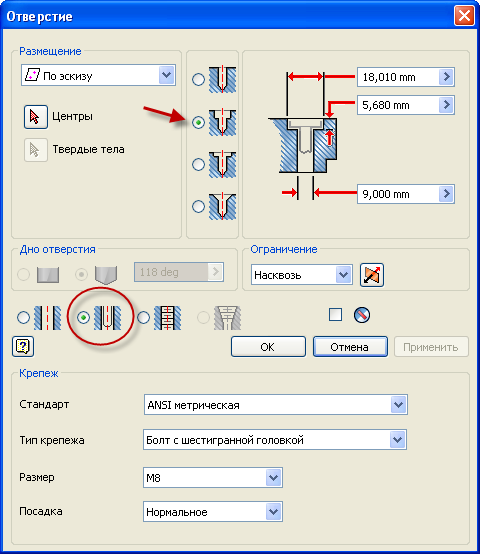 - Для создания отверстия выберите параметры крепежа, показанные на рисунке, и нажмите кнопку ОК.