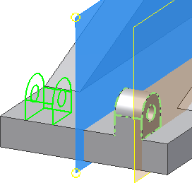 - После выделения элементов щелкните в диалоговом окне стрелку выбора Зеркальная плоскость. Также для этого можно щелкнуть правой кнопкой мыши и выбрать в контекстном меню пункт Далее. Выберите рабочую плоскость в центре детали, чтобы завершить выбор элементов для плоскости отражения. Для создания зеркально отраженных элементов и завершения выполнения команды Зеркало нажмите кнопку ОК.