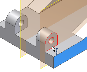 Вызовите команду Зеркало. В качестве элементов для создания зеркального отображения выберите выдавливание и сквозное отверстие. Выберите рабочую плоскость в центре детали, чтобы завершить выбор элементов для плоскости отражения.