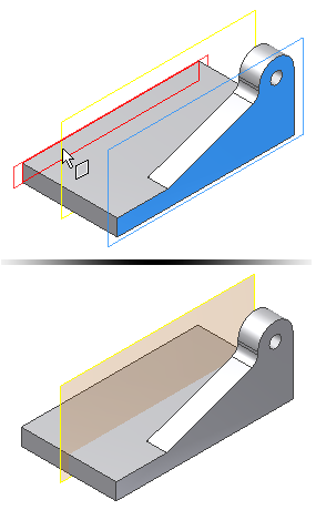 Выберите в раскрывающемся меню Плоскость пункт Симметрично между двумя параллельными плоскостями. Для того чтобы создать рабочую плоскость, которая разделит деталь пополам, выберите грань с новым элементом и затем выберите параллельную грань на противоположной стороне детали. Рабочая плоскость будет создана в середине детали.