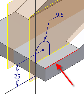 Вызовите команду Проецировать геометрию. Выберите переднее ребро, как показано на рисунке, для проецирования на эскизную плоскость, а затем создайте эскиз и определите размеры отображаемого контура. При создании размера25 мм убедитесь в том, что выбрано нижнее ребро детали.