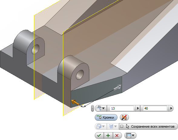 - В левом поле ввода на мини-панели инструментов введите значение 13 мм для параметра Расстояние 1и 40 мм для параметра Расстояние 2 в правом поле ввода. Нажмите кнопку Ребра и выберите вертикальное ребро на наружной части детали. Если в режиме предварительного просмотра вид детали отличается от показанного на следующем рисунке, поменяйте значения длины местами или нажмите кнопку смены направления для изменения опорной грани на противоположную.