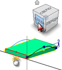 Выполните команду "Сплайн" и создайте эскиз сплайна от центральной точки спроецированной вертикальной линии до точки, расположенной над центральной точкой детали. Разместите последнюю точку в центре спроецированной вертикальной линии напротив. Дважды щелкните кнопкой мыши последнюю точку для завершения создания сплайна.