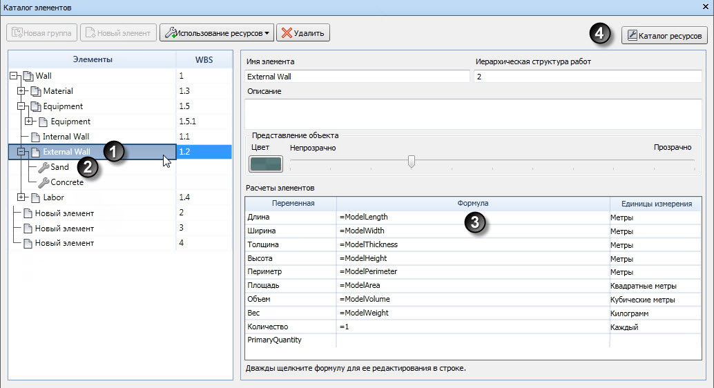 Каталог элементов представляет собой организационную базу данных выборки с расчетом. Каталог элементов и каталог ресурсов имеют одну и ту же структуру, дерево выбора, панель переменных и общие сведения. Элементы в каталоге элементов могут быть непосредственно связаны с объектом модели, таким как стена или окно. Элементы могут существовать самостоятельно или могут содержать ресурсы.