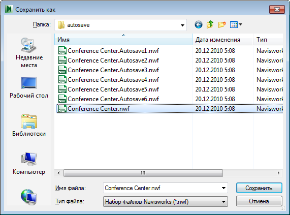 Введите имя файла, используйте поле "Тип файла" для выбора одного из собственных форматов Autodesk Navisworks (NWF или NWD), выберите папку для файла и нажмите кнопку "Сохранить".