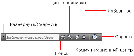 Функция Инфоцентр встречается в нескольких продуктах Autodesk. Она включает в себя набор инструментов в правой части строки заголовков, который дает доступ ко множеству источников информации о продукте. Эти инструменты могут отличаться в зависимости от продукта Autodesk и конфигурации. Например, в некоторых продуктах на панели Инфоцентра может располагаться кнопка Вход для служб Autodesk Cloud.