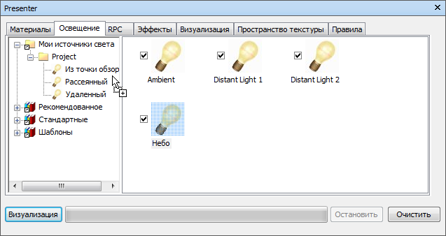 - В окне "Оформитель" на вкладке "Освещение" выберите источник света на правой панели и перетащите его в нужное место в составе узла "Мои источники света" на левой панели таким образом, чтобы возле курсора появился маленький значок плюса.