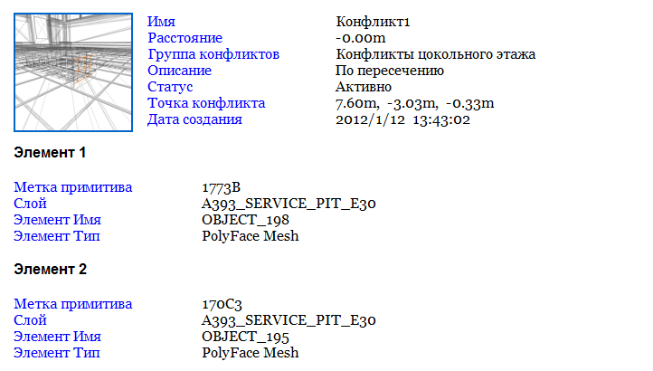 - Если выбран вариант HTML (табличный), создается файл формата HTML с таблицами, содержащий все конфликты и изображения их точек обзора в формате JPEG вместе с подробными сведениями о них. В этом случае потребуется выбрать или создать папку для файлов и ввести имя файла HTML. Файлы таблиц HTML можно открыть и отредактировать в Microsoft Excel 2007 и более поздних версиях.