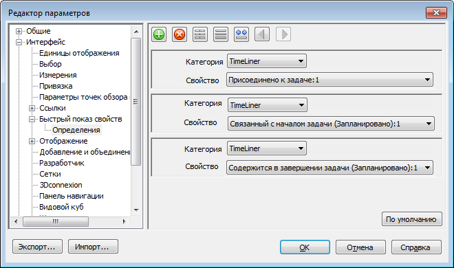 - Разверните узел "Интерфейс" в редакторе параметров, разверните пункт "Быстрые свойства" и щелкните запись "Определения".