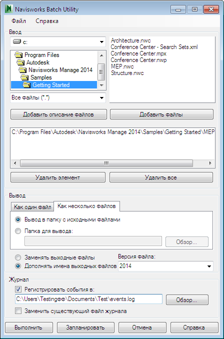 - В диалоговом окне Autodesk Navisworks используйте область "Ввод" для создания списка проектных файлов, которые следует преобразовать.