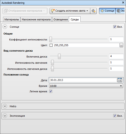 Вкладка "Среды" предназначена для работы со свойствами солнца и неба, а также с параметрами экспозиции.
