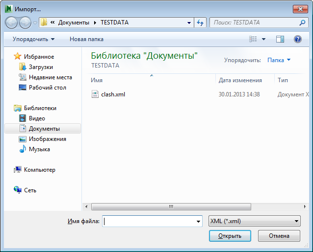 - В диалоговом окне Импорт перейдите к папке, содержащей данные проверки на наличие конфликтов, выберите файл и нажмите кнопку Открыть.