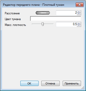 Добавление эффектов переднего плана осуществляется аналогичным образом, как добавление эффектов переднего плана. Дважды щелкните по эффекту на палитре, чтобы открыть редактор переднего плана. Для каждого типа переднего плана в этом окне отображаются различные параметры. Ниже показано окно редактора для эффекта "Туман":