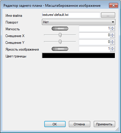 В редакторе фона можно изменять фоновое изображение. Для этого следует нажать кнопку "Обзор" (...) возле поля "Имя файла" и выбрать новое изображение для фона.