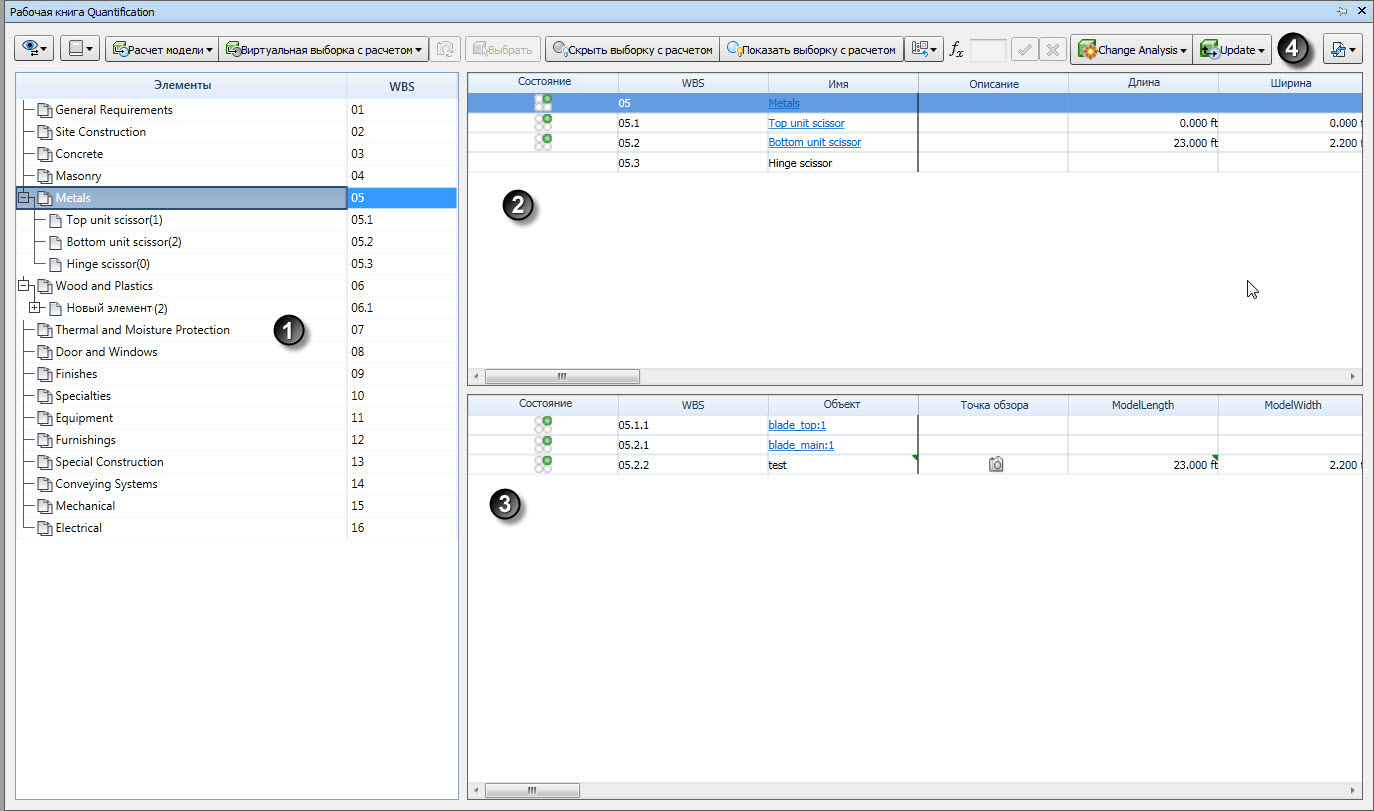 Рабочая книга Quantification — это основное рабочее пространство. Здесь можно выполнить выборку с расчетом модели (автоматически) или виртуальную выборку с расчетом (вручную). В рабочей книге Quantification можно выбрать представление по элементам или по ресурсам, щелкнув .