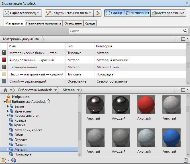 - Материалы. Обеспечивает навигацию и управление коллекциями (библиотеками) материалов, включенными в Autodesk, а также создание пользовательских библиотек для конкретных проектов. По умолчанию библиотека материалов содержит разнообразные материалы, которые доступны для выбора и применения к модели. На этой вкладке можно как создавать новые материалы, так и адаптировать существующие.