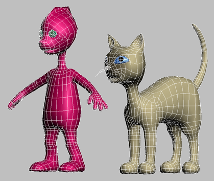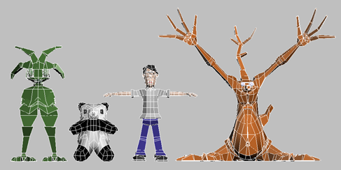 骨骼结构变形的字符网格叫做蒙皮。在 Character Studio 中,Physique 是应用到蒙皮上的修改器,以使蒙皮能够由 Biped 或其他骨骼结构变形而来。下图演示了不同骨骼的网格。
