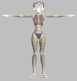 例如,下图是角色最初设计的模型,但此模型并没有考虑 Physique 最佳的多边形分布。众多不规则形状的多边形(特别是臀部周围)以及腿部靠得太近的姿势,使得此模型在应用 Physique 之后难以使用。
