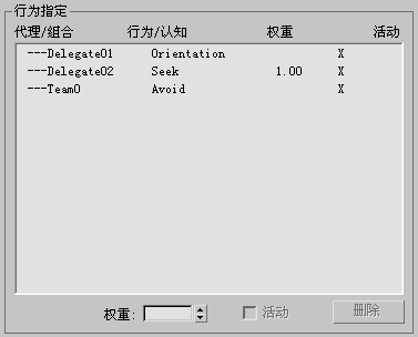 - 显示当前所有行为指定,包括组合或代理名称、指定的行为或认知控制器、权重设置和活动状态。
