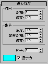 - 指定角度变化的最大数量。每当周期结束后,character studio 会在“偏离”设置的正负值之间选取一个随机值,再乘以“角度”设置,然后将结果加到“角度”中。默认值为 0.5。范围从 0.0 到 1.0。