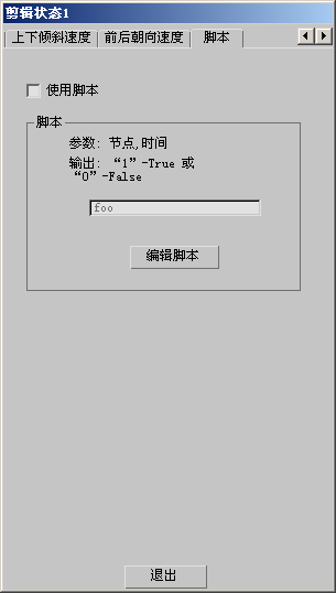 脚本状态选项可用来创建带两个参数的“MAXScript”脚本:节点和时间。脚本通常测试一个或多个值,之后如果条件(测试结果)为真就返回 1,如果条件为假则返回 0。此结果决定是否激活状态。