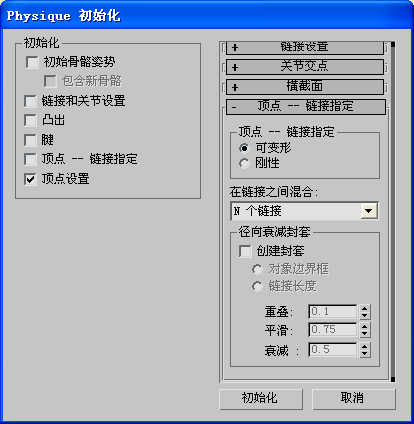 使用“Physique”卷展栏上的“重新初始化”命令可重置角色蒙皮行为的特定属性。其中,常见的用法是重置凸出、删除腱部、重新指定顶点-链接指定,或者将重新定位与附加模型有关的 Biped。从根本上讲,您可以重新初始化,以便重置“初始化”组中的一个项目或全部项目。