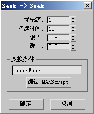 开放部分含有“fn”(函数)接下来是函数名,这些函数名也必须出现在状态变换对话框中,然后是输入参数“del t”,最后是“= (”。接下来可以是任何 MAXScript 代码,也可以什么都不包含。