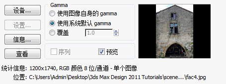 “查看图像文件”。在“查看文件”对话框中,导航到 \sceneassets\images 文件夹,然后高亮显示 fac4.jpg。 在“查看文件”对话框的左下角,有一个状态条显示图像的尺寸,即 1200 x 1740 像素。
