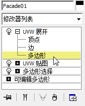 与设置 Facade1 入口面的纹理的方式相同,您可以使用“展开 UVW”设置 Facade4 的入口面的纹理。由于这些面的排列方式不同,因此您可以使用其他“展开 UVW”技术。