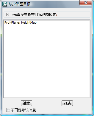 单击“继续”清除“缺少贴图目标”消息框。我们有意将高度贴图保留为未指定状态,因为在下一课中,您将单独指定它。