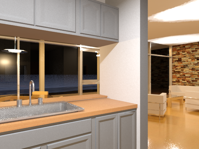 渲染结果显示,当大部分光源非常理想地照亮内部时,厨房灯光过于明亮,从而掩盖了橱柜和器具的细节。但是并不需要返回并调整 Revit 中灯光的强度,您可以使用 3ds Max 中的控件来完成相同的任务。