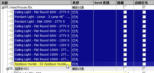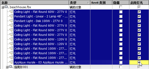 您之前导入的是禁用光度学灯光的 Revit 场景,因为日光渲染并不需要光度学灯光。现在,只需单击鼠标,即可使用“场景资源管理器”重新启用灯光。
