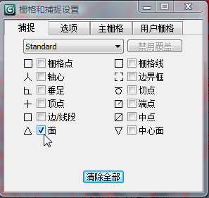 (捕捉开关)以打开“栅格和捕捉设置”对话框。在此对话框中,单击“清除全部”,然后单击以启用“面”。