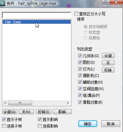 “合并”。打开 hair_spline_cage.max。在“合并”对话框中,单击 Hair_Cage 对象以高亮显示它,然后单击“确定”。