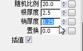 - 在“常规参数”卷展栏上,将“根厚度”的值更改为 2.5,将“梢厚度”的值更改为 0.25。
