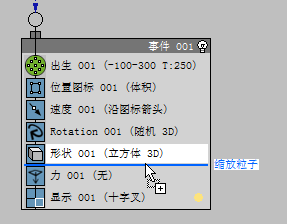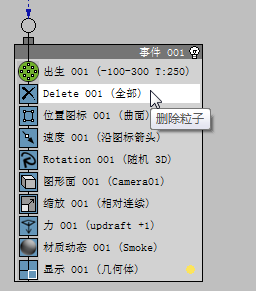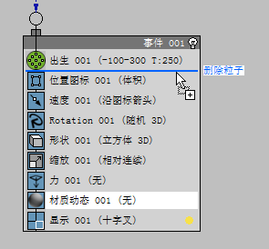 - 在“粒子视图”中,将“Delete”操作符从仓库拖至 Event 01,并将其放置在“Birth”和“位置图标”操作符之间。
