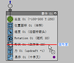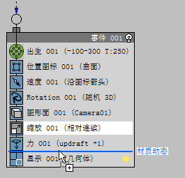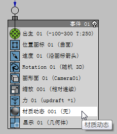 - 将“Material Dynamic”操作符从仓库拖至 Event 01,并将其放置在“Force”和“Display”操作符之间。