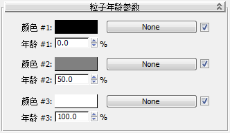 “粒子年龄”贴图指定三种颜色:默认情况下,“颜色 #1”是粒子在出生 (0%) 时的颜色,“颜色 #2”是粒子在达到中期寿命 (50%) 时的颜色,“颜色 #3”是粒子在消亡 (100%) 时的颜色。 您可以更改这些年龄,但是在本教程中不会执行此操作。