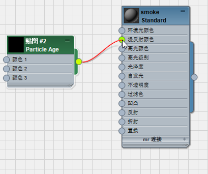 - 在活动视图中,将“粒子年龄”贴图输出关联到“标准材质漫反射颜色”输入。