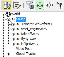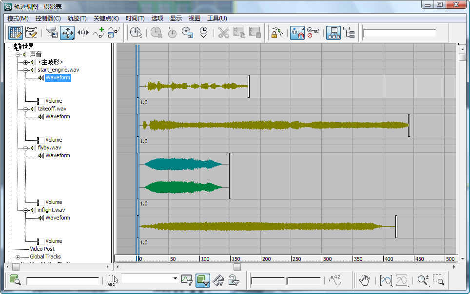 第一、第二和第四个声音轨迹以单声道方式录制,因此显示为单个波形。第三个声音轨迹 flyby.wav 以立体声方式录制,显示为两个波形,一个表示左声道,另一个表示右声道。