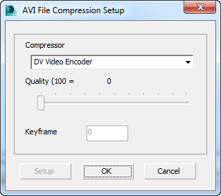 此时显示“AVI 文件压缩设置”对话框。在该对话框中可以选择编码解码器(压缩/解压缩类型),并调整文件质量。接受默认的编解码器。若要减小文件大小,可以降低“质量”值。