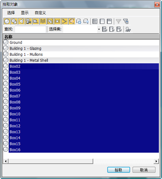 - 按 H 键打开“拾取对象”对话框。在列表中,选择全部长方体对象,然后单击“拾取”。