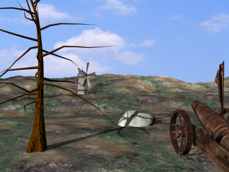使用 3ds Max 的基本功能,可创建一个简单的内含大炮、岩石、树和风车的战场场景。您还将添加摄影机并使用它从不同的角度观察场景。
