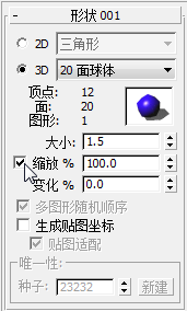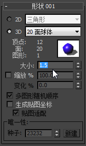 - 在“图形”卷展栏上,保持选中“3D”,然后从“3D”下拉列表中选择“20 面球体”。
