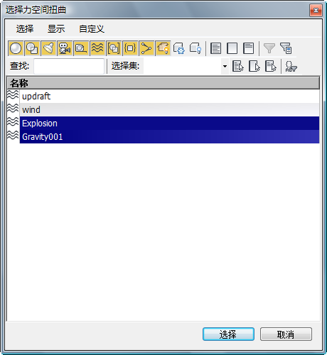 - 在“选择力空间扭曲”对话框中,单击然后在按住 Ctrl 键的同时单击以选中空间扭曲 Explosion 和 Gravity001,然后单击“选择”。
