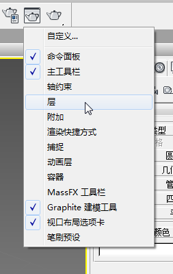 - 默认情况下,启动 3ds Max 时,“层”工具栏处于隐藏状态。如果当前未打开,那么右键单击主工具栏空白处,并从弹出菜单中选择“层”。