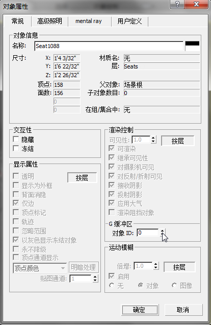 “G 缓冲区”组中,“对象 ID”显示为 0。所有对象在首次创建时被指定的 ID 都为 0。稍后,您将更改此数字,以为某些座椅对象组指定它们自己不同的材质。