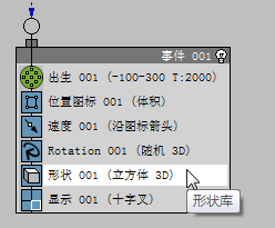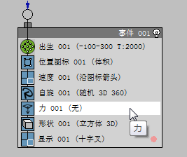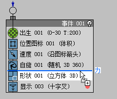 - 在“粒子视图”左下方的“仓库”中,单击以高亮显示“Force”操作符,然后将其拖至事件显示,并恰好放置在 Event 01 上的“Shape”操作符上方。