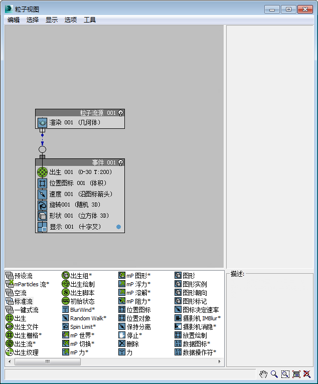 “粒子视图”是粒子流系统的主要界面。您可以在其中添加和调整粒子行为。在此窗口中,主要区域包括左上方的事件显示和左下方的“仓库”,前者显示已创建的事件,后者包含可添加到事件显示的操作符。